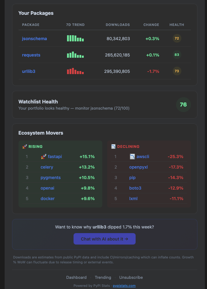 Pro and Enterprise users receive a personalized digest every Monday with AI commentary, health scores, sparklines, and ecosystem trends.